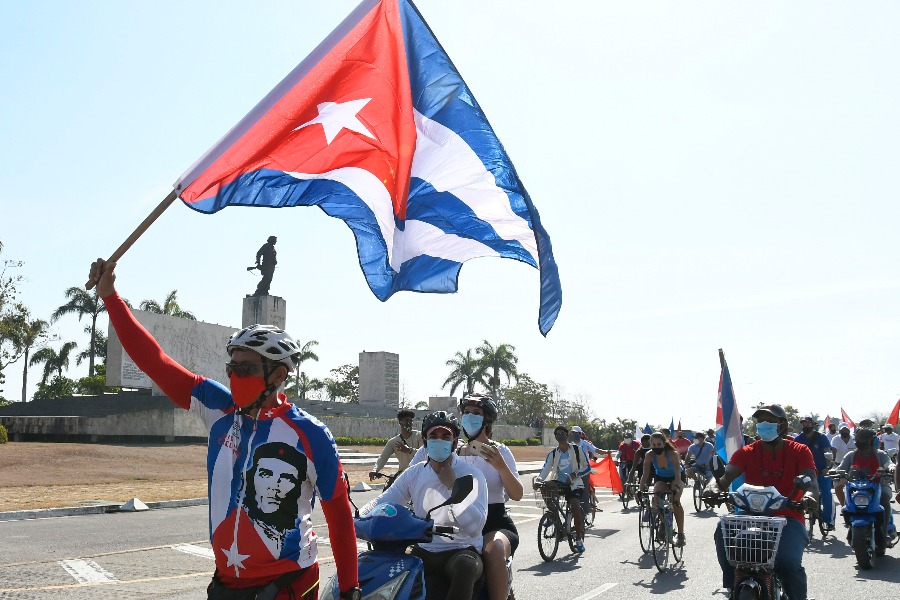 4月25日,人們手舉古巴國旗在古巴中部城市聖克拉拉參加遊行。古巴多地當天舉行遊行活動,參與民眾要求美國解除對古巴近60年的封鎖。(新華社發,華金·埃爾南德斯攝)
