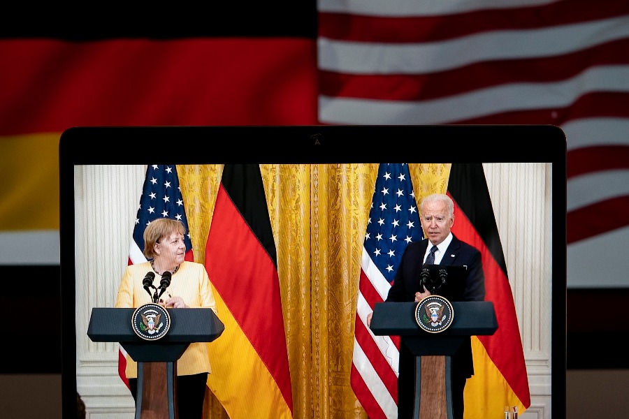 7月15日拍攝的直播畫面顯示,美國總統拜登(右)與到訪的時任德國總理默克爾在美國華盛頓白宮舉行聯合記者會。(新華社記者劉傑攝)