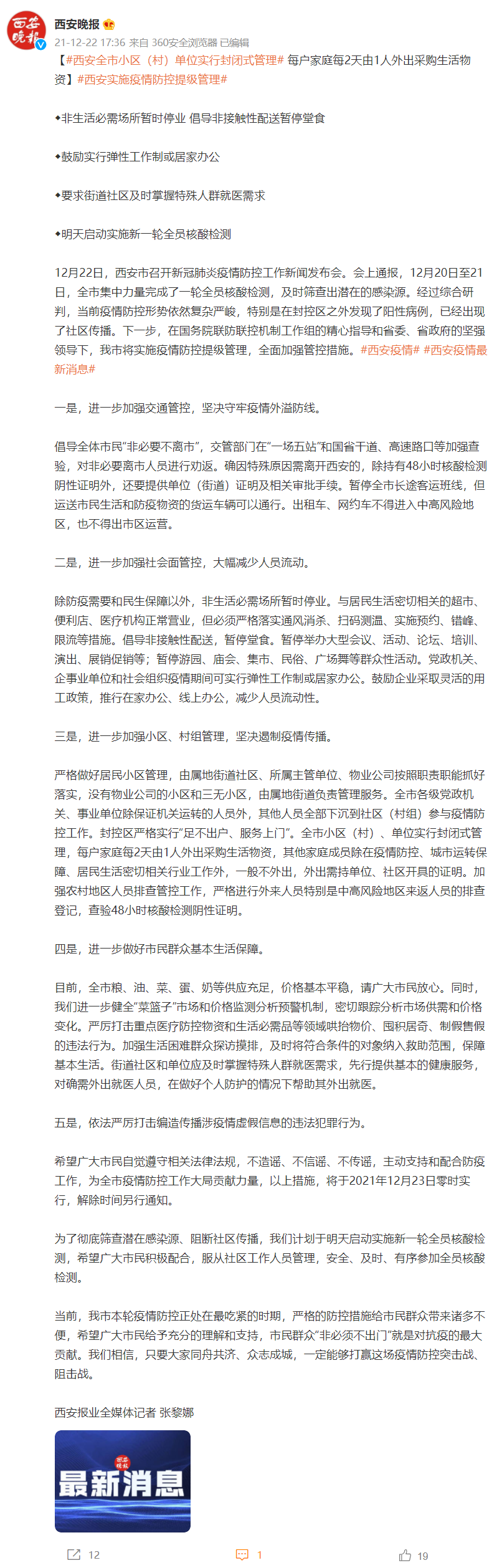 【#西安全市小區(村)單位實行封閉式管理# 每户家庭每2天由1人外出採購生活物資】#西安實施疫情防控提級管理#