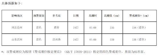 預計12月23日夜間至24日上午,渤海灣和萊州灣將出現70到160釐米的風暴增水,上述岸段內的河北黃驊和山東濱州潮位站將於24日早晨出現達到當地藍色警戒潮位的高潮位。河北省滄州市和山東省濱州市的風暴潮預警級別為藍色。