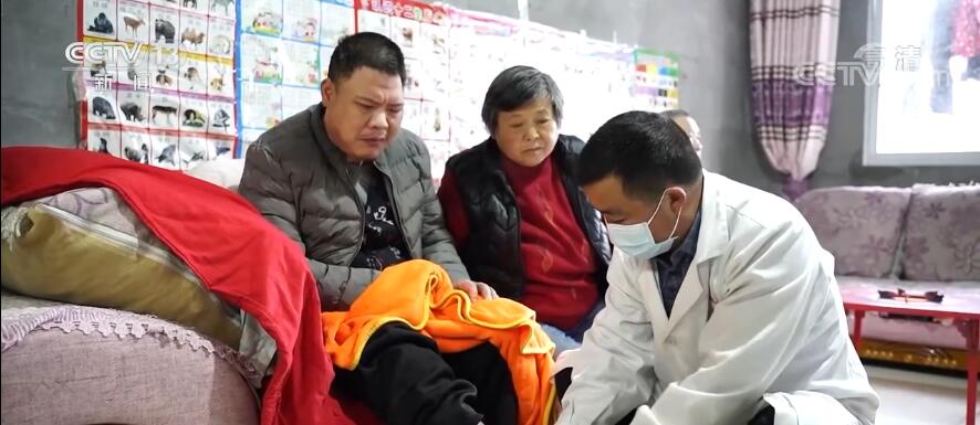 在四川省巴中市恩陽區雪山鎮牛頸村張菊花家裏,家庭簽約醫生正在對她的兒子進行身體複查。張菊花一家原是建檔立卡貧困户,2年前全家脱了貧。今年3月,她兒子突發腦出血,高額的醫療費用導致開支劇增,讓這個家庭陷入了困境,面臨返貧風險。