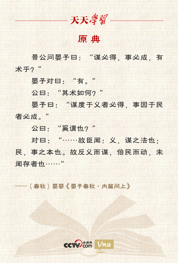 “謀度於義者必得,事因於民者必成”出自《晏子春秋》,意思是謀劃時考慮符合道義的就一定能夠實現,做事時注重順從民意的就一定能夠成功。