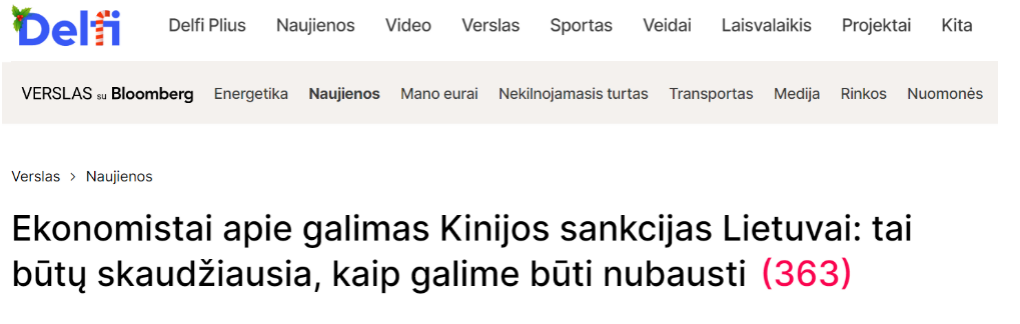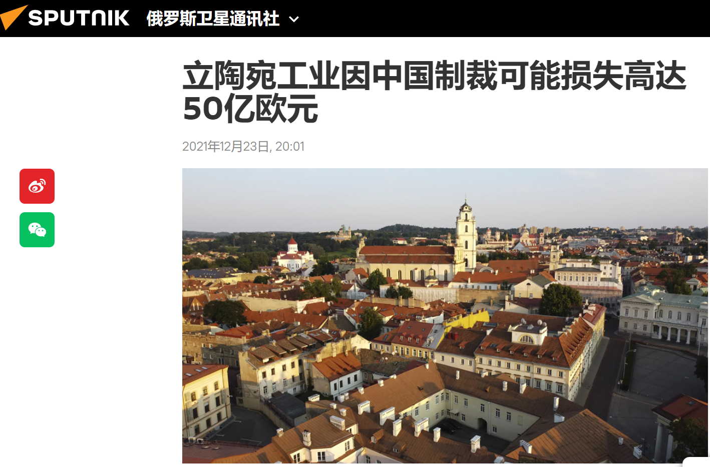綜合俄羅斯衞星通訊社及立陶宛Delfi門户網站23日報道,對於有消息聲稱,中方可能會考慮對立陶宛實施經濟制裁,立陶宛工業家聯合會主席維德曼塔斯•雅努利亞維丘斯表示,如若中國實施制裁,立陶宛工業每年的損失可能高達30至50億歐元。雅努利亞維丘斯在談及中國對立陶宛實施制裁的可能性時還稱,那將是最痛苦的懲罰方式。