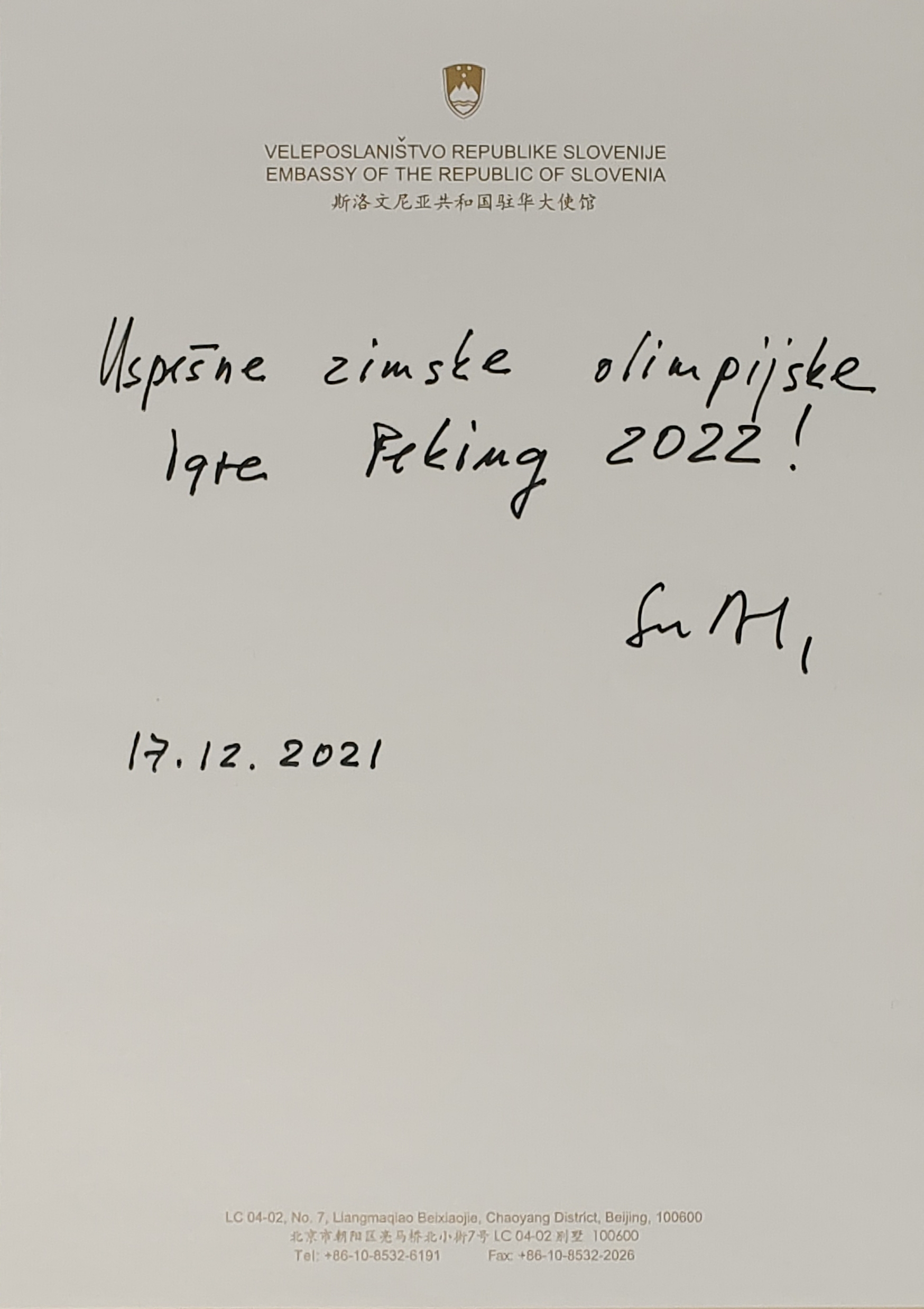 斯洛文尼亞駐華大使蘇嵐為北京冬奧會題寫寄語。