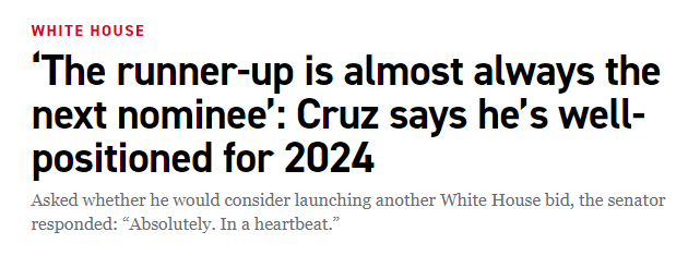 “政客”新聞網介紹稱,克魯茲在接受一個叫做“真理公報”的保守派新聞機構採訪時表達了這一想法。報道稱,當被問及他是否考慮再次參加美國總統大選,他回覆:“絕對的。(我會)立馬(參加)。”