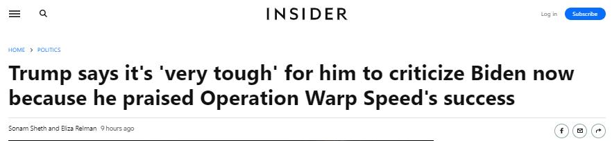 美國“商業內幕”網站22日消息稱,對於美國總統拜登當地時間21日對前任政府研發新冠疫苗所做努力的“罕見”表揚,特朗普同日作出回應,稱自己現在“很難”去批評拜登了。