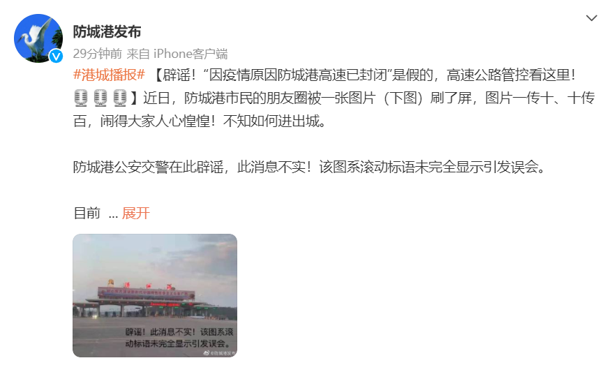 廣西防城港闢謠:“因疫情原因防城港高速已封閉”系假消息