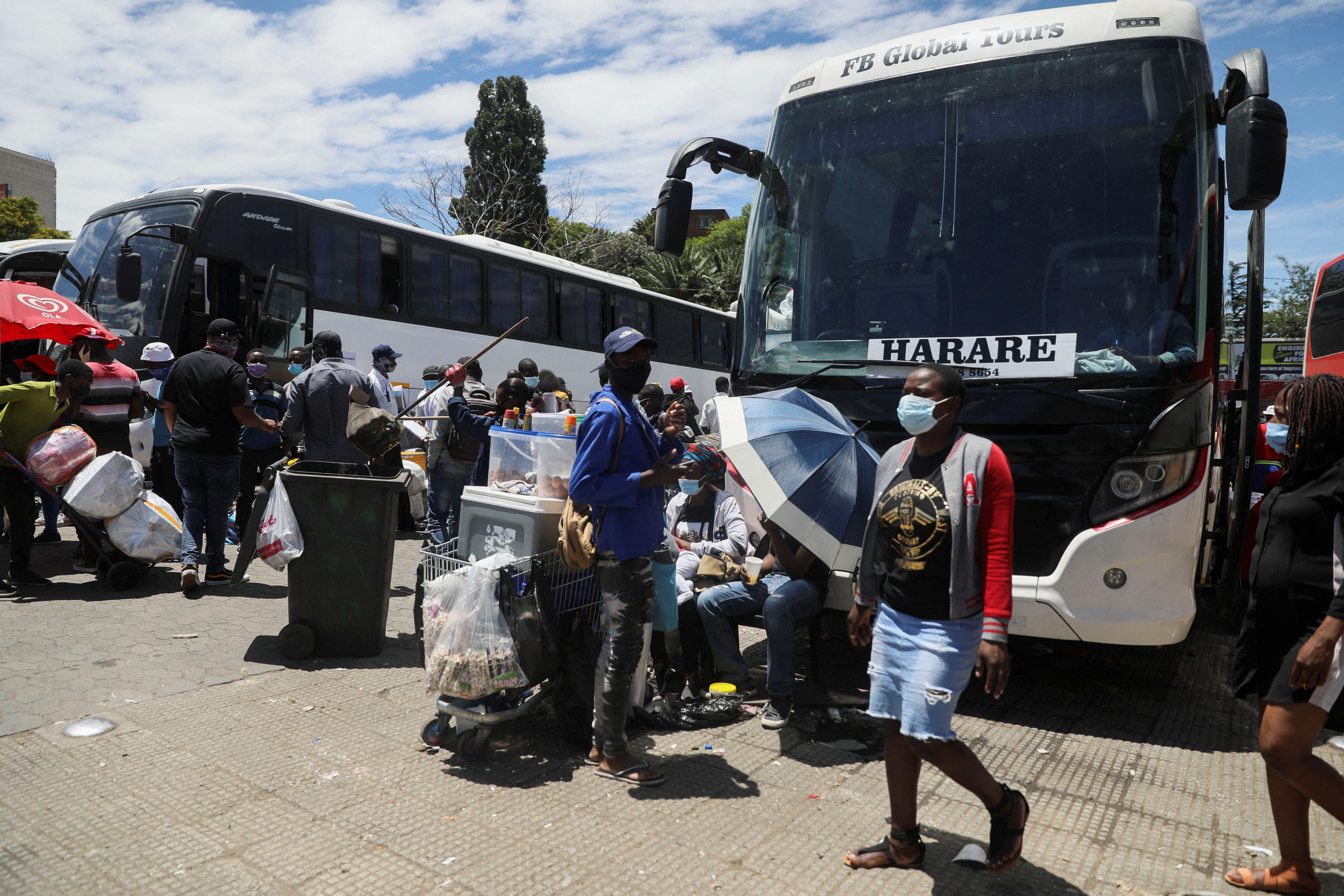 △南非一個長途汽車站,乘客準備搭乘前往津巴布韋的大巴
