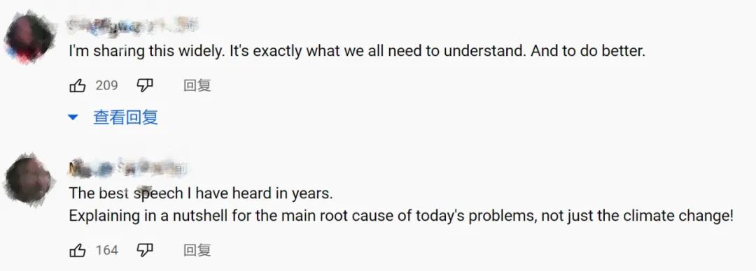 “這是我近些年聽過最好的演講,言簡意賅地解釋了當今問題的根源,並不侷限於氣候變化方面。”