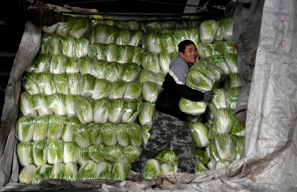 12月19日,西安西部欣橋農產品物流中心內,工人正在搬運蔬菜。新華社記者 劉瀟 攝