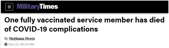 【環球網報道 記者 張海潮】據美國《軍隊時報》23日報道,美國軍方22日確認,一名已經完全接種疫苗的美軍人員死於新冠併發症。這一病例被證明是“突破性”的。此前美國防部一直報告稱,在美軍死亡病例中,儘管有兩人部分接種新冠疫苗,但沒有出現完全接種疫苗的美國軍人死亡。
