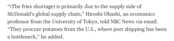 日本東京大學經濟學教授大橋弘説:“(薯條短缺)主要是由於麥當勞全球供應鏈的供應方造成的。日本麥當勞從美國採購土豆,而美國的港口運輸一直面臨瓶頸。”