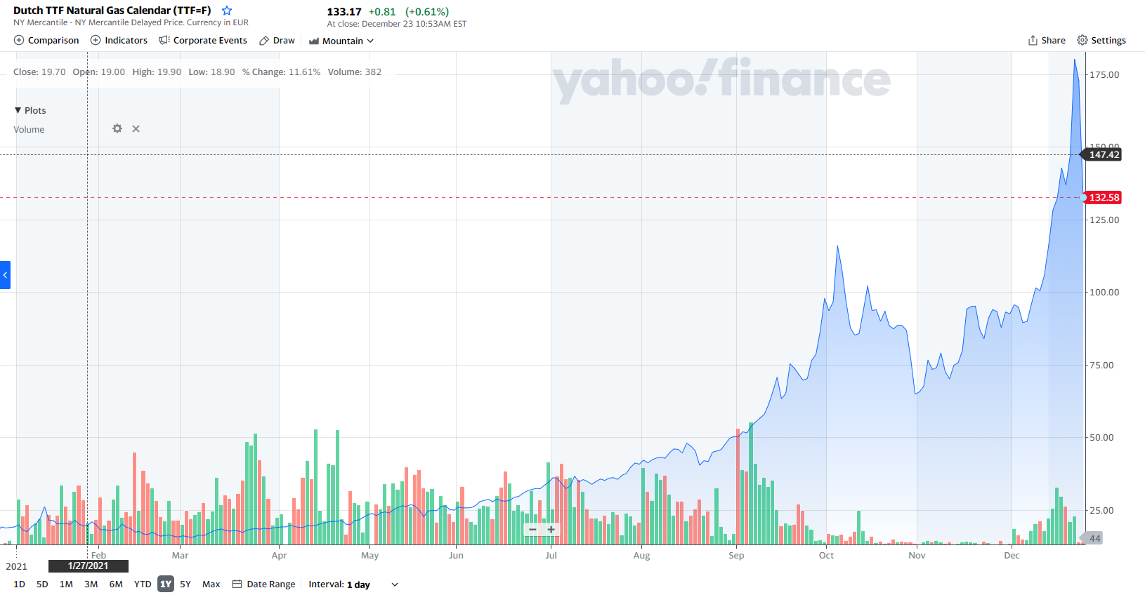 今冬能源危機席捲歐洲,天然氣、電力價格飆漲,德國、烏克蘭、塞爾維亞、西班牙、希臘等國都受到顯著影響。歐洲天然氣基準價格21日再創新高,相比今年年初漲幅達800%。後續天然氣價格雖有所回落,但24日的價格與今年年初相比漲幅仍超過400%。彭博社24日的報道指出,歐洲的能源危機看不到任何緩解的跡象。