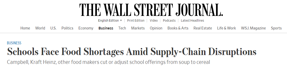 △《華爾街日報》報道截圖:《因供應鏈中斷,多家學校面臨食物短缺》