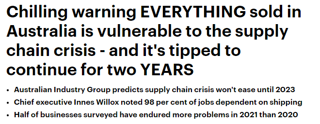 澳大利亞工業集團首席執行官英內斯·威洛克斯(Innes Willox)説,澳大利亞98%和貿易相關的工作依賴於航運,疫情造成全球供應鏈混亂。他表示,預計供應鏈危機要到2023年以後才會緩解。
