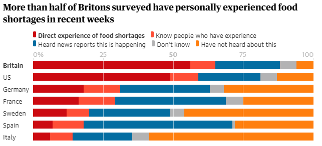 據《衞報》22日報道,一項調查顯示,與法國、德國、西班牙、意大利、瑞典和丹麥相比,英國民眾親身經歷或知道身邊有人曾經歷食物和燃料短缺的可能性要高出數倍。