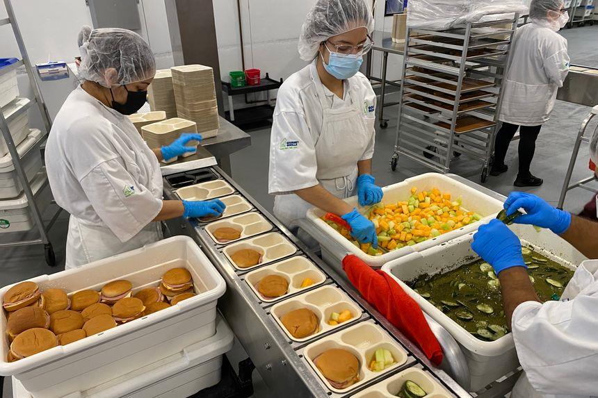 △美國芝加哥學校膳食供應商Gourmet Gorilla的工人們正在準備學生午餐(圖片來源:《華爾街日報》)