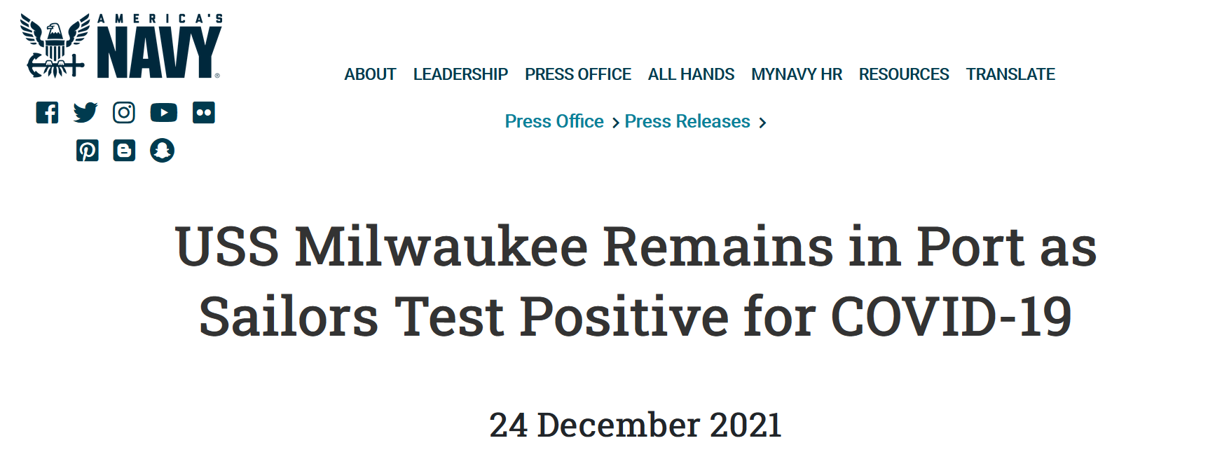 據報道,美國海軍在平安夜發佈聲明證實,“密爾沃基號”戰鬥艦上一些艦員的新冠檢測呈陽性,感染者出現輕微症狀,已經與其他艦員隔離,但目前都留在船上,“密爾沃基號”目前停靠在關塔那摩灣海軍基地。RT稱,美國海軍拒絕透露有多少人感染新冠病毒,但吹噓艦員接種的新冠疫苗“繼續證明了對嚴重疾病的有效性”。