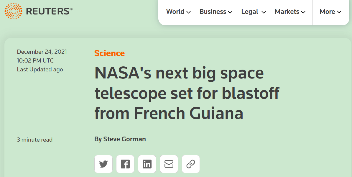 路透社稱,韋布太空望遠鏡將在美東時間25日早上7時20分,搭載阿麗亞娜-5運載火箭從法屬圭亞那發射基地發射升空。預計將在升空26分鐘後從運載火箭分離。報道稱,韋布太空望遠鏡重達1.4萬磅(約6.35噸),造價90億美元,被NASA譽為未來十年首要的空間科學天文台。