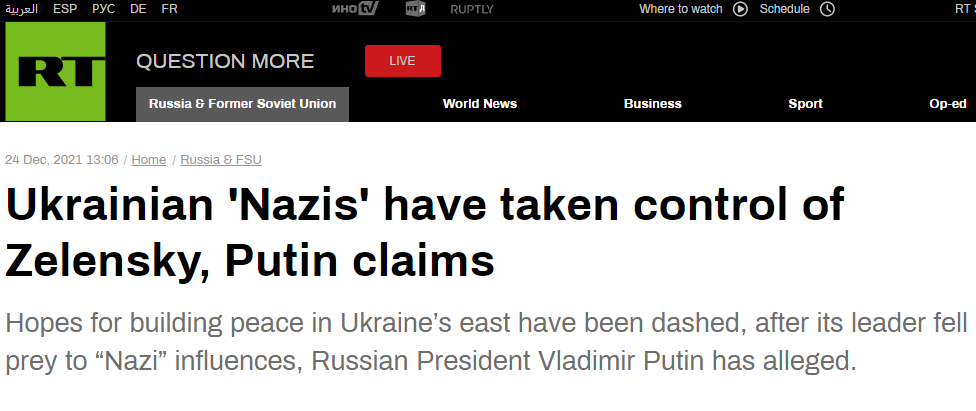 據報道,俄羅斯總統普京23日年終新聞發佈會上向記者表示:“澤連斯基沒有回應人民對和平的需求……他上台後非但沒有滿足這些要求,反而像他的前任一樣,受到激進分子的支配——正如同他們在烏克蘭所説的‘納粹分子’那樣。”