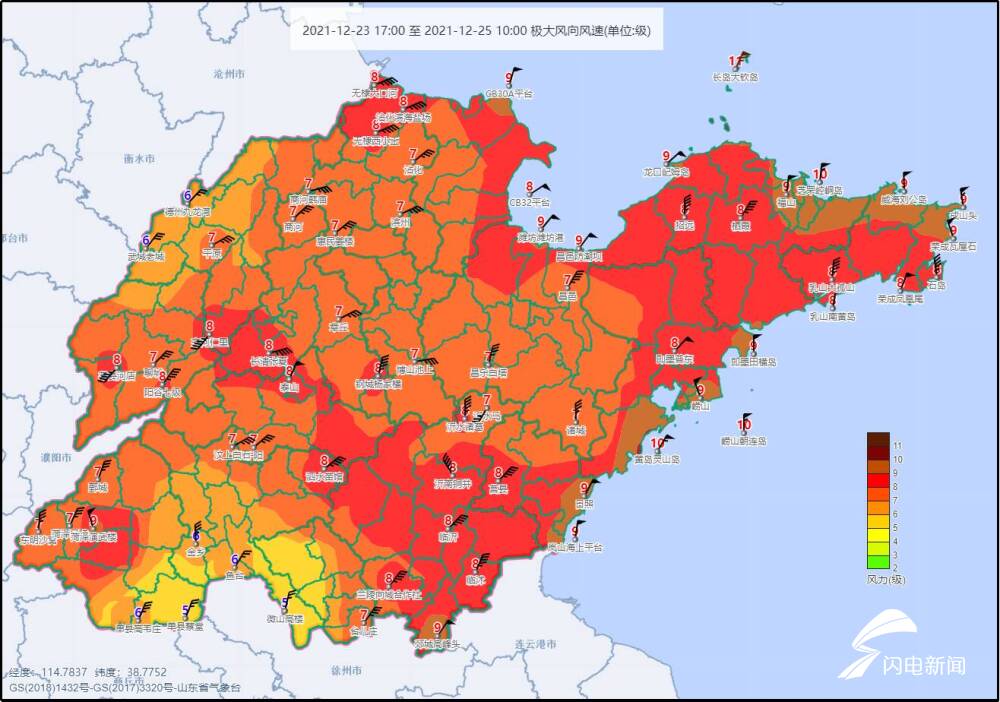 2021年12月23日17時至25日10時山東極大風分佈(級)