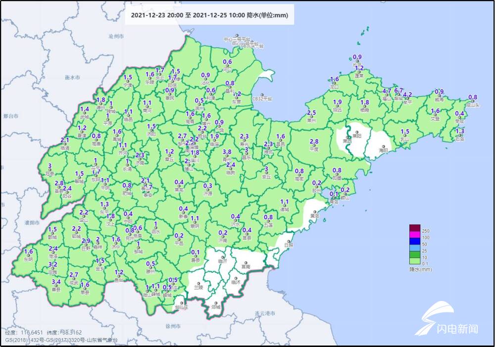 2021年12月23日20時至25日10時山東降水量分佈(毫米)