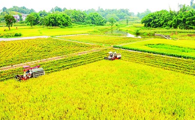 四川瀘州市江陽區通灘鎮田灣村村民在收割水稻。新華社發