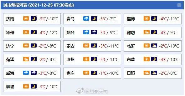 夜間最低氣温:魯中山區-8°C左右,其他地區-6°C左右。