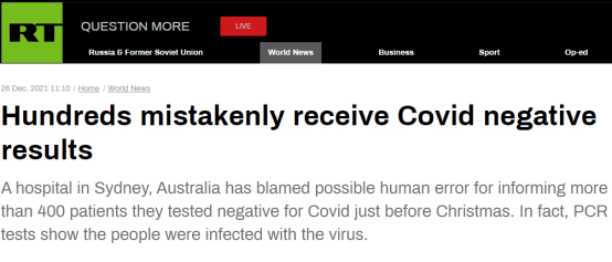 據“今日俄羅斯”(RT)消息,澳大利亞新州城市悉尼一醫院26日發佈消息稱,聖誕節前夕在其醫院做過核酸檢測的400多名患者,此前錯誤地收到了“陰性”通知,實際上他們的檢測結果均呈“陽性”。