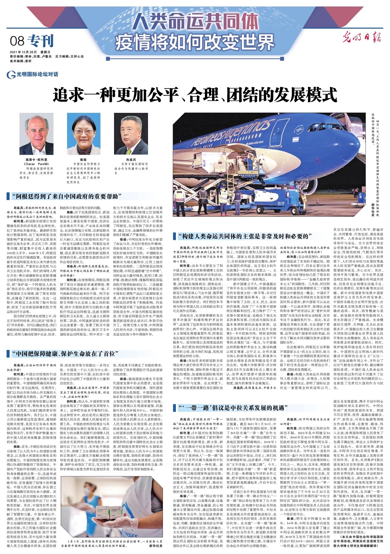 *帕利裏:*在疫情期間,阿根廷得到了來自中國政府的重要幫助,幫助阿根廷挺過難關的、最早一批、不可或缺的藥品就來自中國。阿方安排國家航空公司的航班完成布宜諾斯艾利斯與北京或上海之間的航程,將中方捐助及阿方自購的大量醫療用品運往阿根廷,迅速支援阿根廷的衞生系統。在人道主義援助的第二階段,中阿就新冠疫苗的供應達成重要一致,簽署了購買中國國藥新冠疫苗的協議,數百萬支中國疫苗運往阿根廷。阿中雙方一直致力於開展雙贏合作,以技術為重點,在疫情期間和疫情之後加強雙方的技術交流以及國有企業、私有企業的聯合。中國不僅又一次幫助了阿根廷,而且幫助了很多拉美國家,通過衞生、金融等領域的合作幫助我們緩解了嚴重危機。
