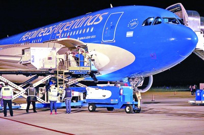 四月一日,工作人員在阿根廷布宜諾斯艾利斯埃塞薩國際機場卸載運抵的中國新冠疫苗。新華社發