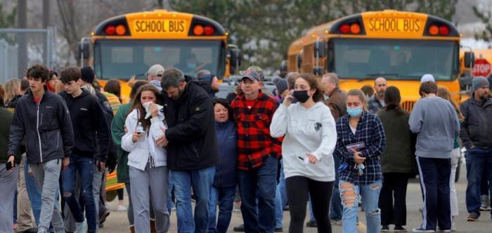 當地時間11月30日,美國密歇根州底特律郊區的牛津高中(Oxford)發生校園槍擊事件。圖為許多學生聚集在梅傑停車場等待家長。