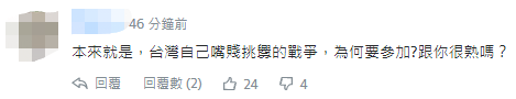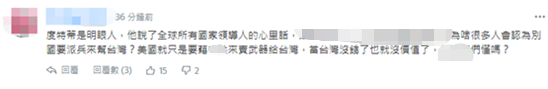 在台媒相關報道下,有島內網友留言對杜特爾特表示認同,説:“本來就是,台灣自己嘴賤挑釁的戰爭,為何要參加?跟你很熟嗎?”