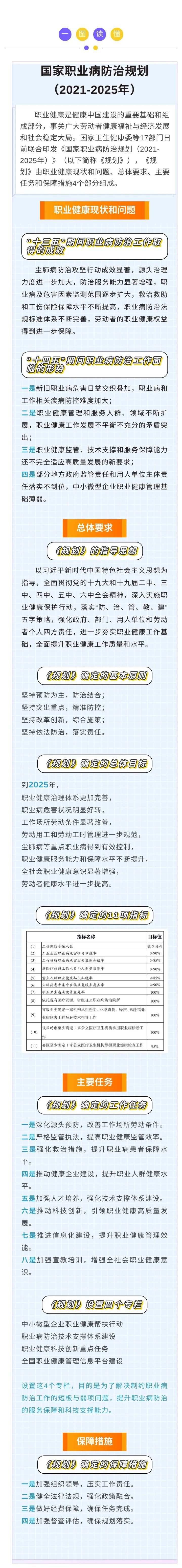 《規劃》要求,到2025年,職業健康治理體系更加完善,職業病危害狀況明顯好轉,工作場所勞動條件顯著改善,勞動用工和勞動工時管理進一步規範,塵肺病等重點職業病得到有效控制,職業健康服務能力和保障水平不斷提升,全社會職業健康意識顯著增強,勞動者健康水平進一步提高。