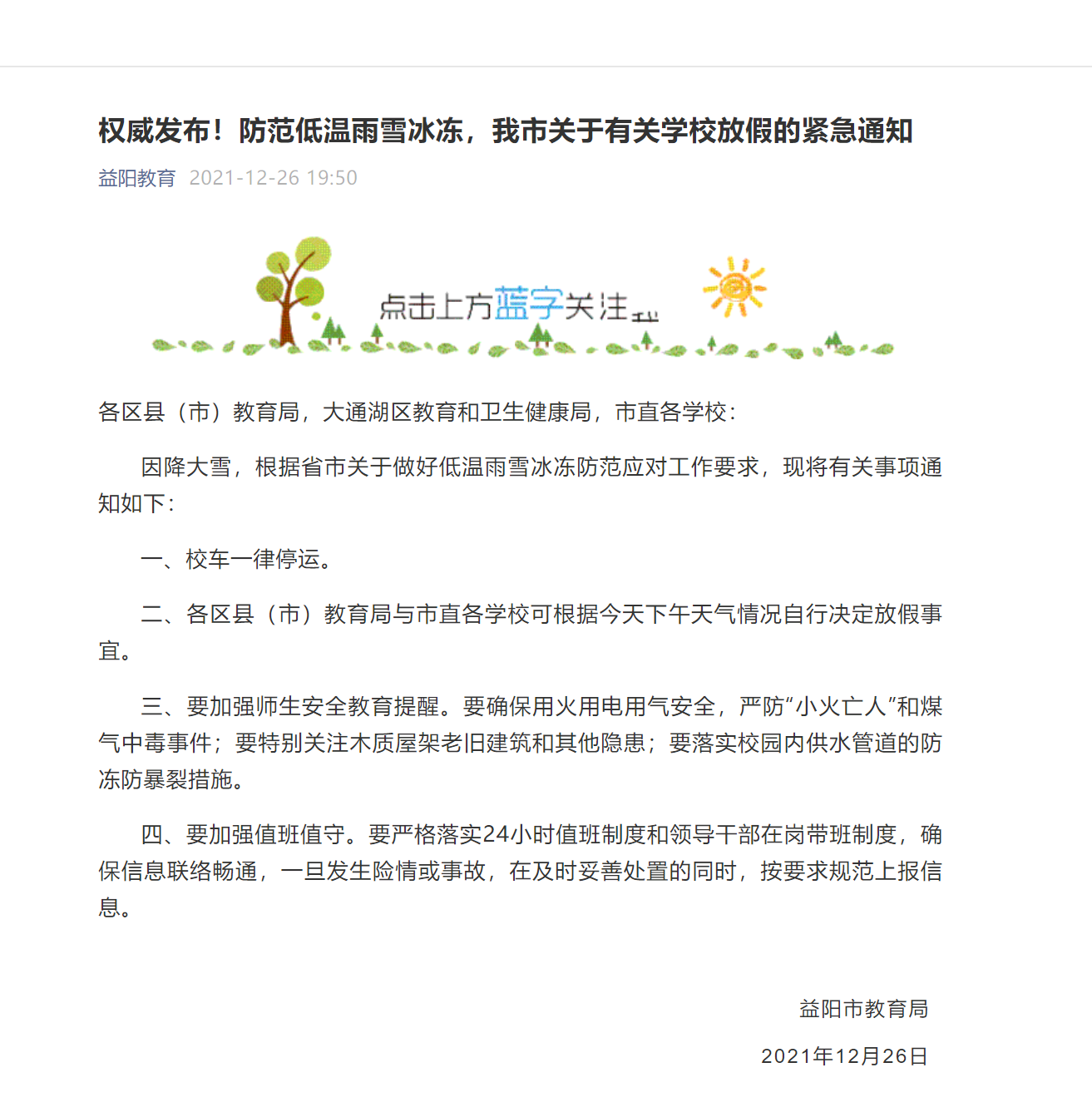 益陽:校車一律停運,各學校自行決定放假事宜。12月26日,益陽市教育局通報稱,因降大雪,益陽市直各學校校車一律停運,各區縣(市)教育局與市直各學校可根據天氣情況自行決定放假事宜。