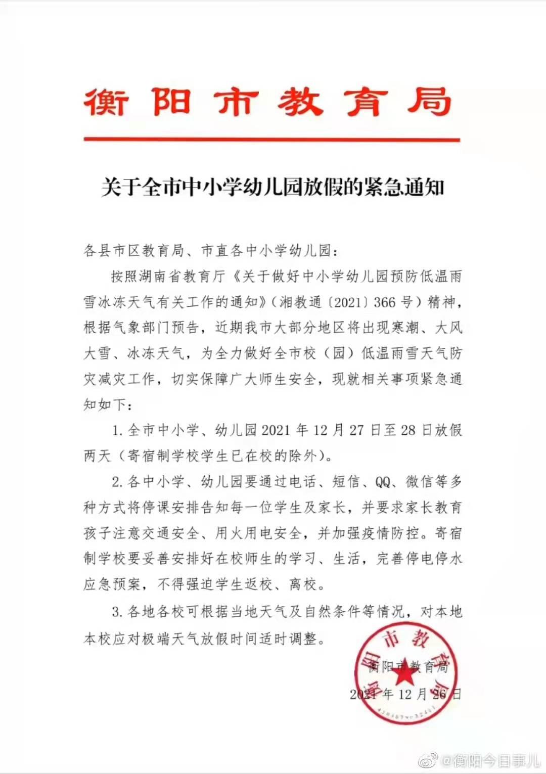 衡陽:全市中小學、幼兒園放假兩天。12月26日,衡陽市教育局通報稱,因降雪冰凍天氣,衡陽全市中小學、幼兒園2021年12月27日至28日放假兩天。