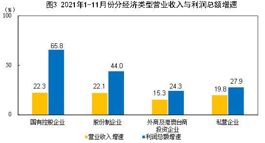 1—11月份,規模以上工業企業中,國有控股企業實現利潤總額23638.1億元,同比增長65.8%;股份制企業實現利潤總額57618.9億元,增長44.0%;外商及港澳台商投資企業實現利潤總額20645.0億元,增長24.3%;私營企業實現利潤總額24984.3億元,增長27.9%。