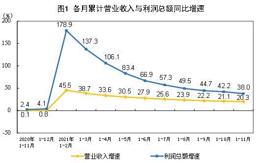 1—11月份,全國規模以上工業企業實現利潤總額79750.1億元,同比增長38.0%(按可比口徑計算,詳見附註二),比2019年1—11月份增長41.3%,兩年平均增長18.9%。