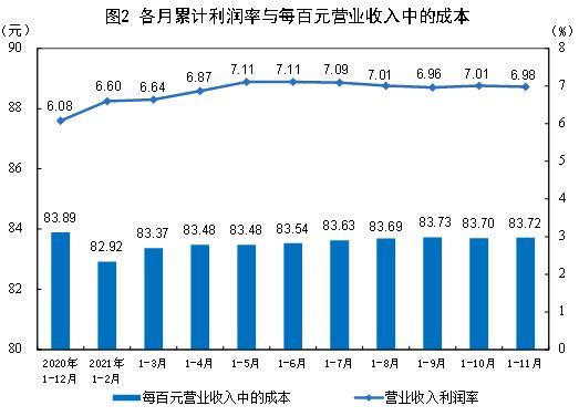 1—11月份,規模以上工業企業實現營業收入114.31萬億元,同比增長20.3%;發生營業成本95.70萬億元,增長19.7%;營業收入利潤率為6.98%,同比提高0.90個百分點。