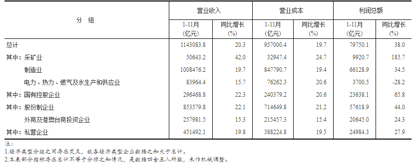 1—11月份,採礦業實現利潤總額9920.7億元,同比增長1.86倍;製造業實現利潤總額66128.9億元,增長34.5%;電力、熱力、燃氣及水生產和供應業實現利潤總額3700.5億元,下降28.2%。