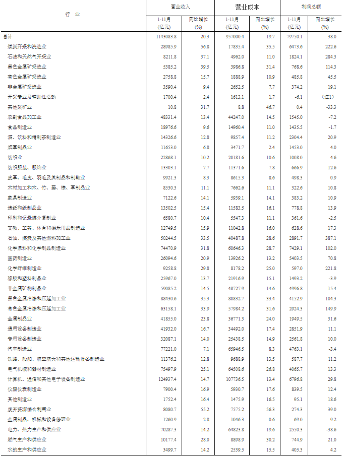 1—11月份,在41個工業大類行業中,33個行業利潤總額同比增長,1個行業減虧,7個行業下降。主要行業利潤情況如下:石油、煤炭及其他燃料加工業利潤總額同比增長3.87倍,石油和天然氣開採業增長2.84倍,煤炭開採和洗選業增長2.23倍,有色金屬冶煉和壓延加工業增長1.50倍,黑色金屬冶煉和壓延加工業增長1.04倍,化學原料和化學制品製造業增長1.02倍,計算機、通信和其他電子設備製造業增長29.8%,非金屬礦物製品業增長15.4%,電氣機械和器材製造業增長13.3%,通用設備製造業增長11.1%,專用設備製造業增長10.0%,紡織業增長4.6%,汽車製造業下降3.4%,農副食品加工業下降7.2%,電力、熱力生產和供應業下降38.6%。