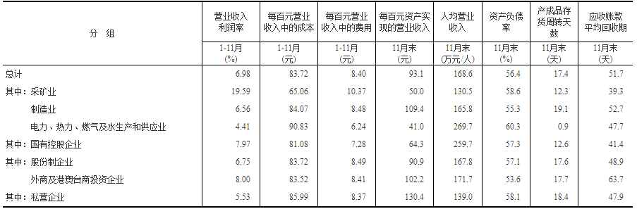 1—11月份,規模以上工業企業每百元營業收入中的成本為83.72元,同比減少0.43元;每百元營業收入中的費用為8.40元,同比減少0.52元。