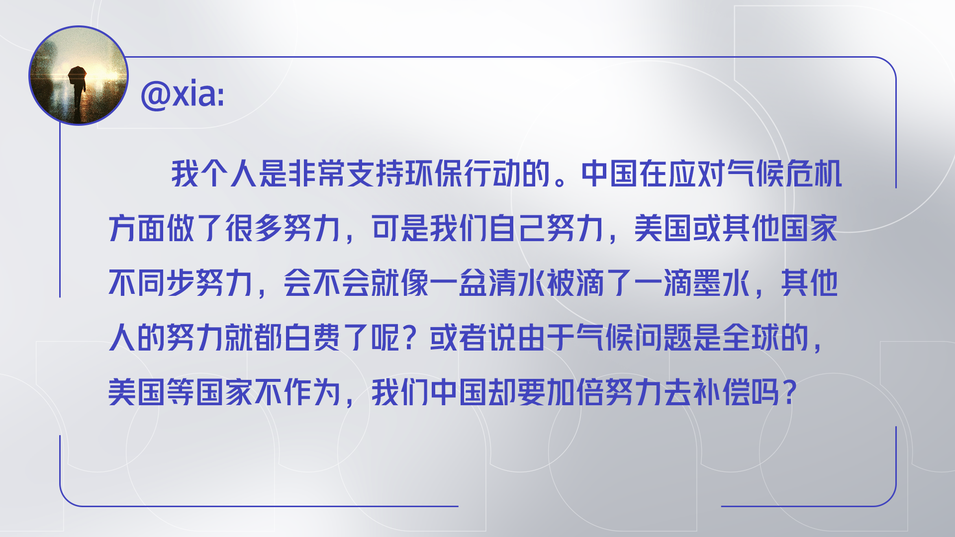但有一點我是贊同這位網友的,光靠中國是救不了氣候的。所以總書記説“推動構建人類命運共同體”,我們要攜手合作應對氣候危機。我們就是為了發展中國家呼籲,充分考慮發展中國家面臨的困難、挑戰,尤其是資金技術方面。除了自己做好,我們還要呼籲、敦促發達國家做得更好,因為他們有歷史責任。