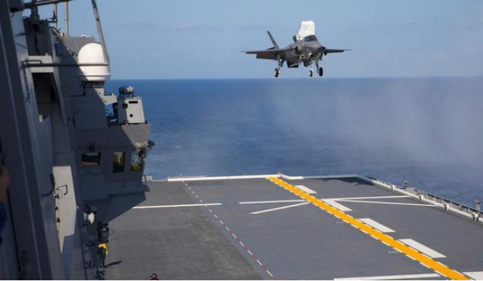 據早前報道,日本防衞省10月5日稱,兩架美國海軍陸戰隊的F-35B在“出雲”號進行了起飛和着艦演練,以驗證飛行甲板的改裝。