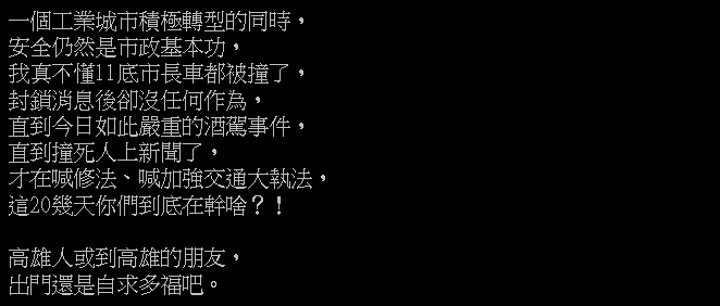 這名網友還説,“直到今日發生如此嚴重的車禍事件,直到撞死人上新聞了,才在喊修法、喊加強交通大執法,這二十幾天你們到底在幹什麼,‘高雄人或到高雄的朋友,出門還是自求多福吧’”。