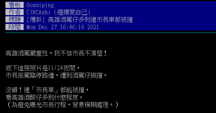 該網友27日傍晚在PTT論壇發文稱,“高雄酒駕嚴重性,我不信市長不清楚!沒錯,連市長車都能被撞,看高雄酒醉仔多到什麼程度。一個工業城市積極轉型同時,安全仍是市政基本功,真不懂11月底市長車都被撞了,封鎖消息後卻沒任何作為。”