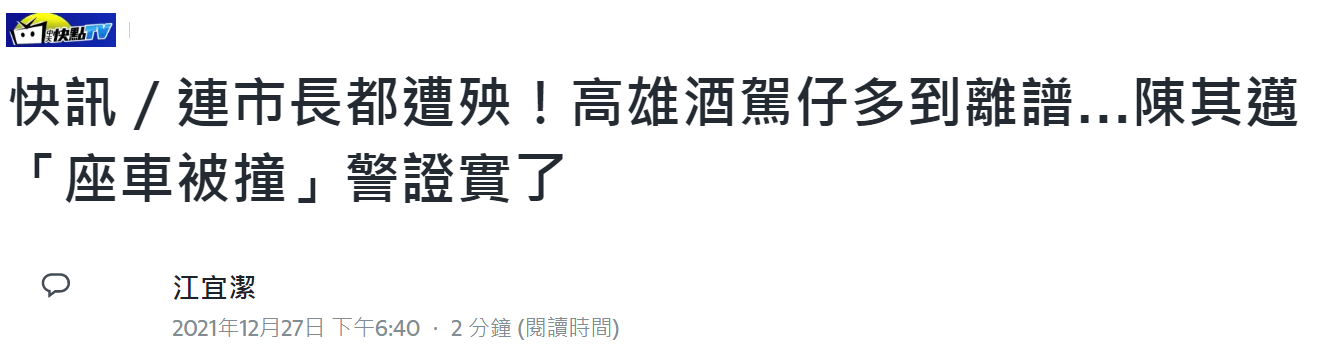 報道稱,黃姓男子酒駕造成1死3傷,在網上引發一片駕聲,其中一台灣網友在PTT論壇發了一篇題為“高雄酒駕仔多到連市長車都被撞”的帖文,爆料11月底市長陳其邁的車都被“酒駕男”撞了。