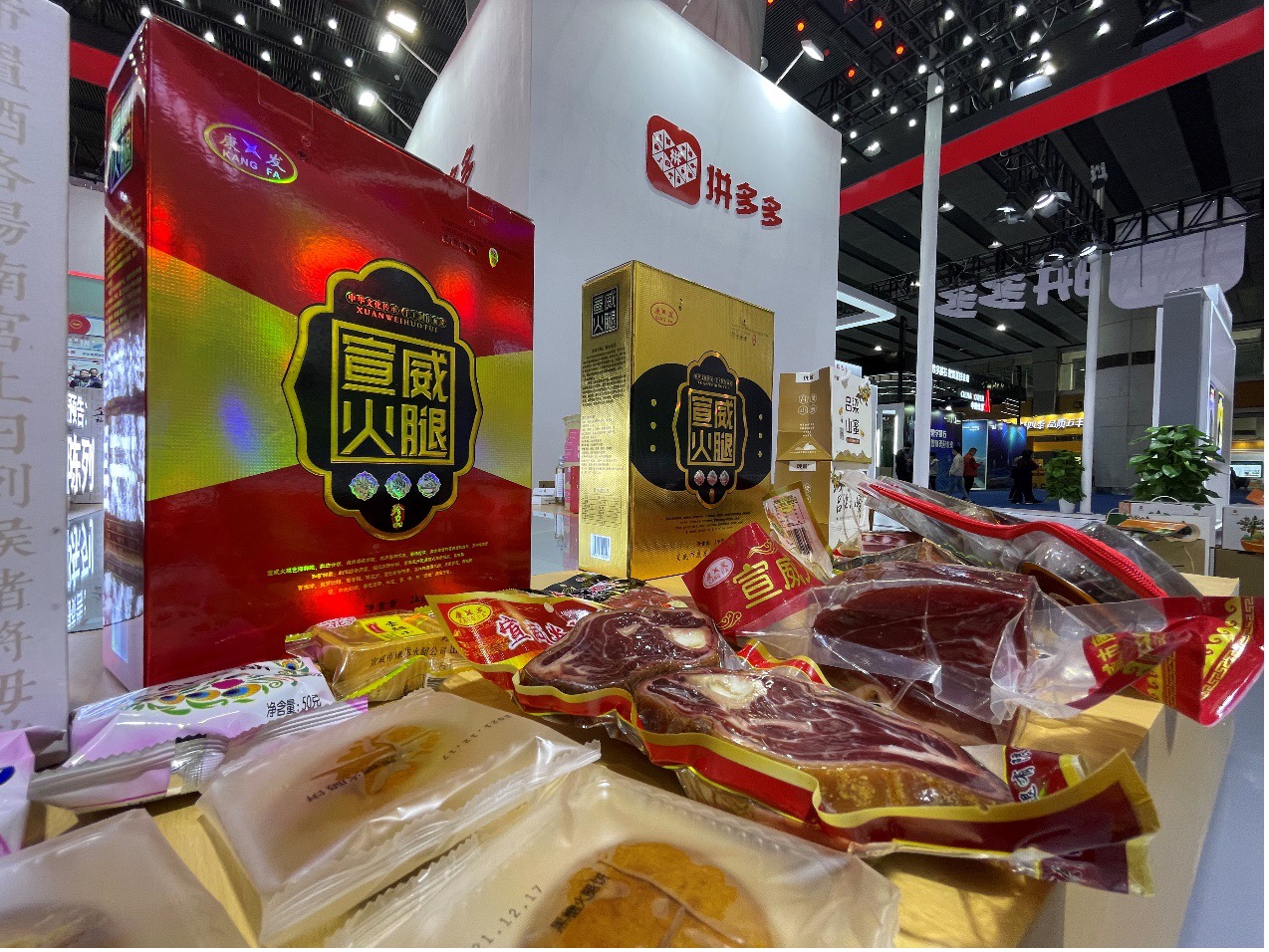 在康發火腿的展台前,滇式雲腿月餅吸引了大批採購商。雲腿月餅外皮金黃酥香,咬上一口滿嘴火腿肉,油脂豐盈。近年來,宣威火腿的產品線得到進一步豐富和創新,雲腿月餅、糕點成為電商平台的新寵。王維毅帶領電商運營團隊,在拼多多平台上深耕了6年,目前雲腿系列產品的月拼單量已經超過20萬單。