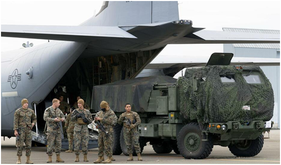 在這場訓練中,美軍首次與自衞隊演練了空運高機動性火箭系統“海馬斯”(HIMARS)。“海馬斯”是一種可被裝入運輸機的先進發射裝置,能瞄準數百公里以外的目標。