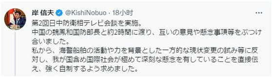 通話結束後,日本防衞省官方推特還專門發了兩條中文帖子,介紹通話內容。雙方就明年開通防務部門直通電話達成一致,更是被單獨列了出來。